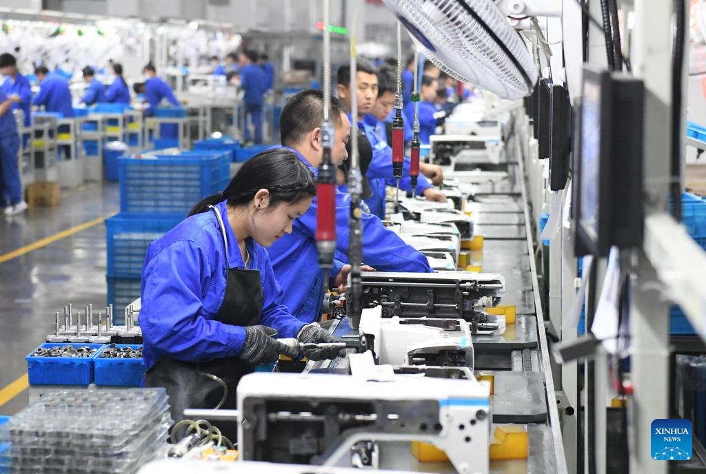 Workers work at a workshop of Jack Sewing Machine Co., Ltd. in Taizhou, east China's Zhejiang Province, March 23, 2023. (Xinhua/Weng Xinyang)