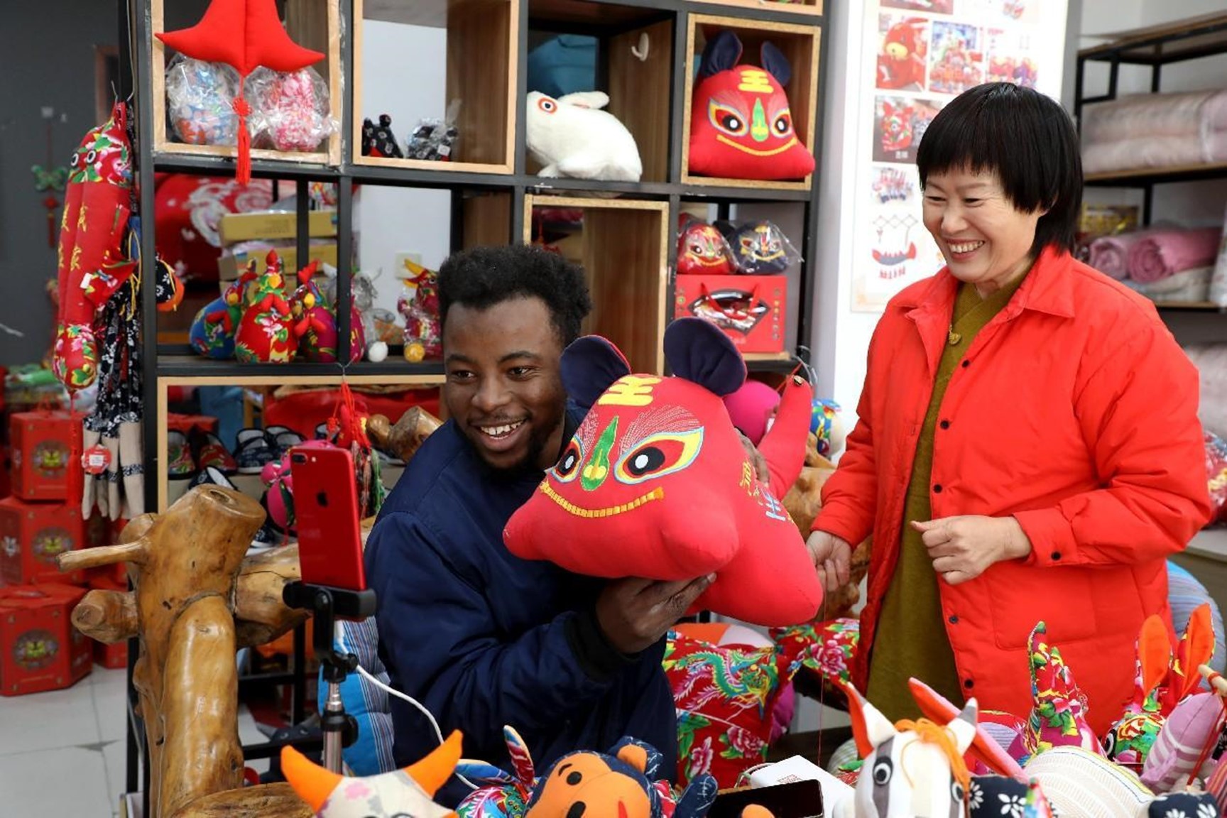 A Nigerian influencer joins a livestream show with Zheng Guangyun, an inheritor of intangible cultural heritage in Yinan county, Linyi, east China's Shandong province, Jan. 29, 2023. (Photo by Du Yubao/People's Daily Online)