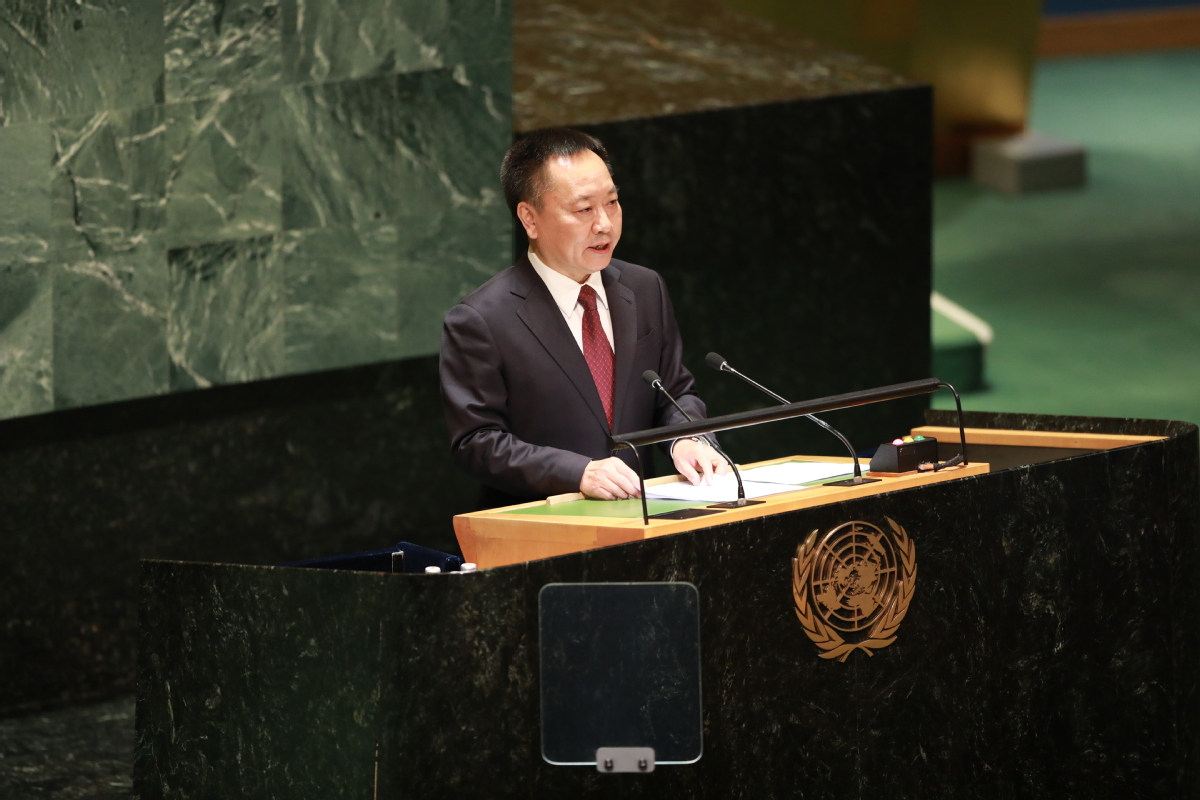 Minister of Water Resources Li Guoying speaks at the 2023 United Nations Water Conference in New York on Wednesday. Xie E / Xinhua