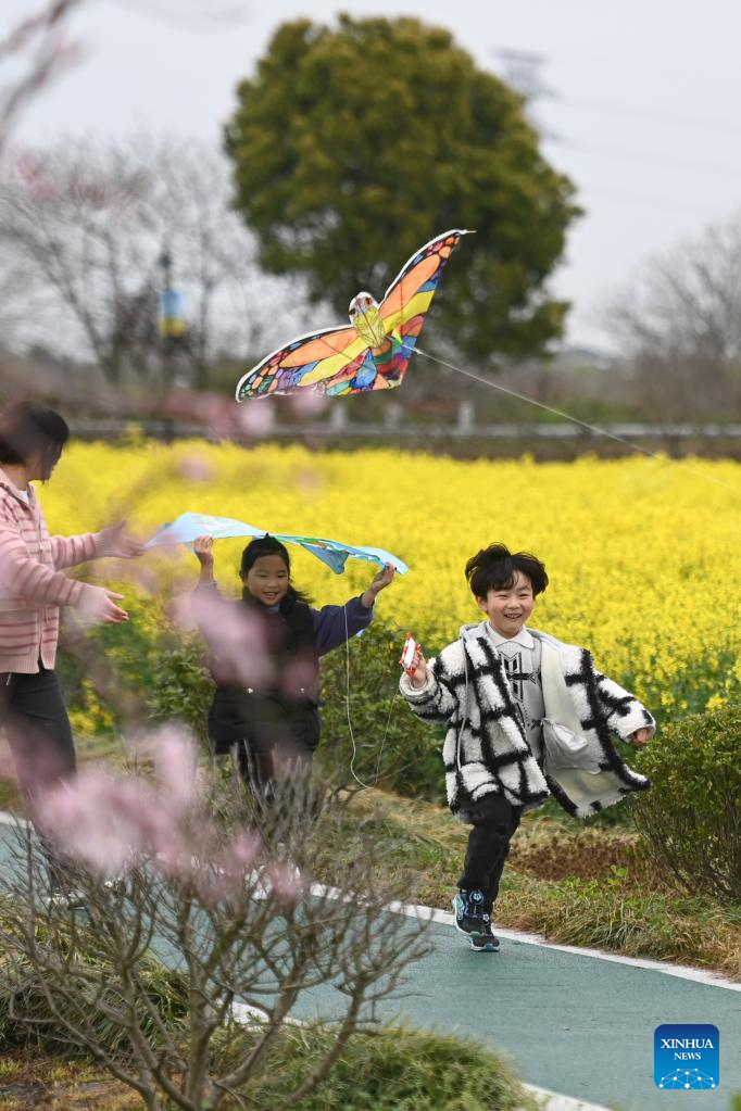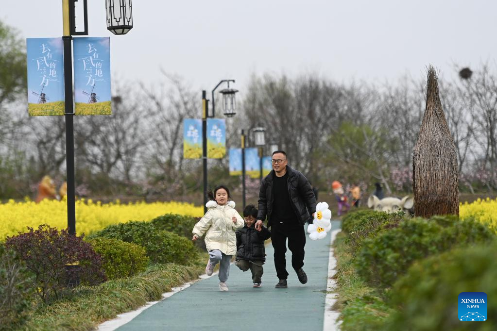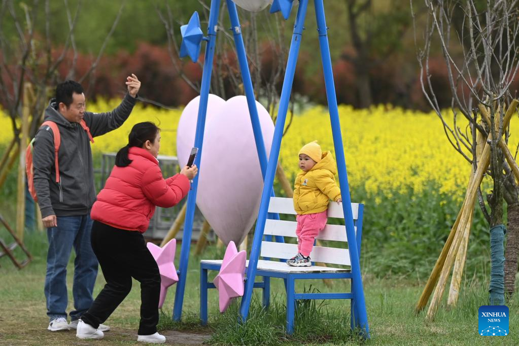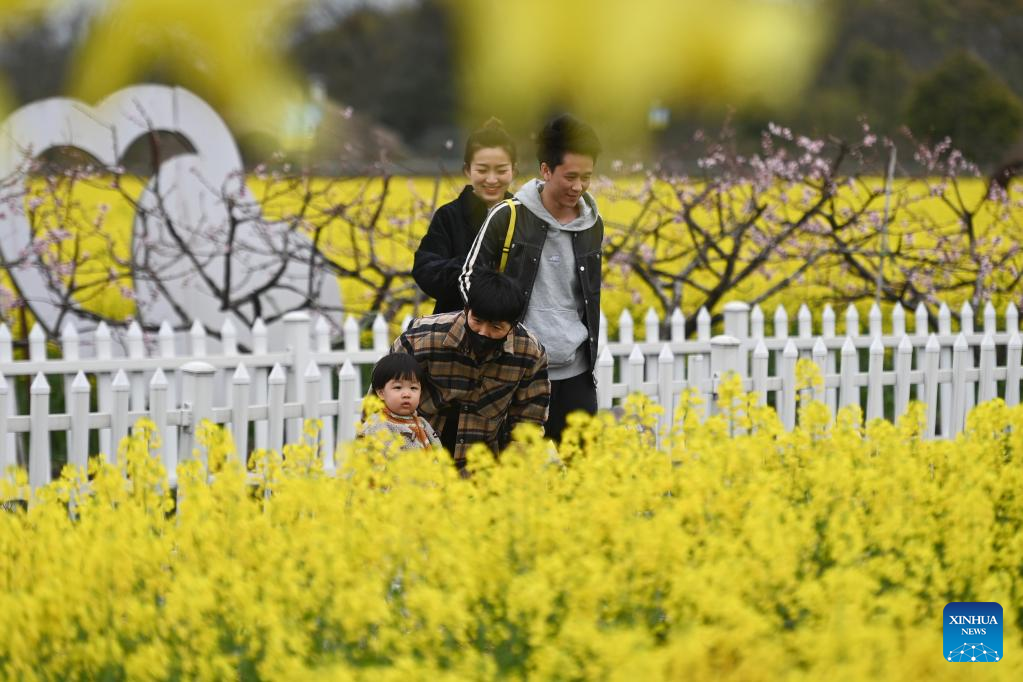 People enjoy their time in a canola flower field at an eco-tourism scenic spot in Balidian Town of Huzhou City, east China's Zhejiang Province, March 25, 2023. (Xinhua/Huang Zongzhi)