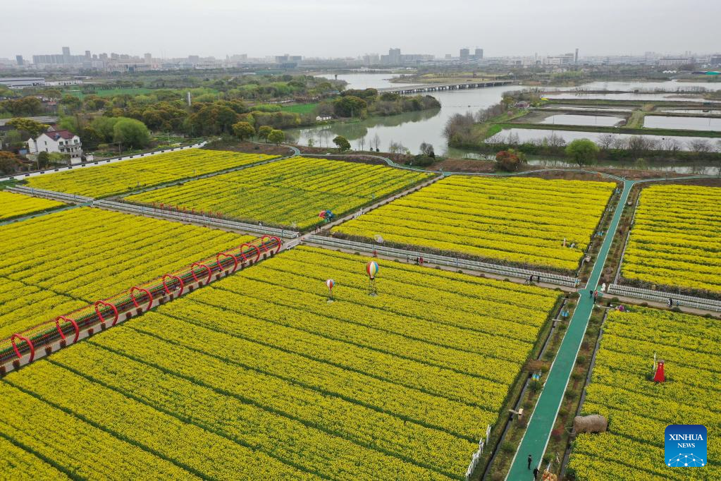 This aerial photo shows people enjoying their time in a canola flower field at an eco-tourism scenic spot in Balidian Town of Huzhou City, east China's Zhejiang Province, March 25, 2023. (Xinhua/Huang Zongzhi)