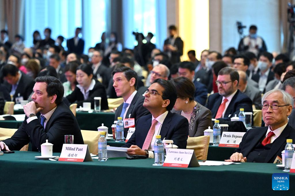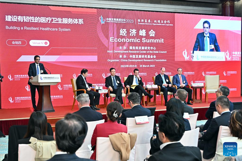 Delegates attend a parallel session of the Economic Summit of the China Development Forum (CDF) 2023 at a branch venue in Beijing, capital of China, March 25, 2023. The Economic Summit of the CDF 2023 was held here on Saturday. Themed "Economic Recovery: Opportunities and Cooperation," the CDF 2023 takes place offline at the Diaoyutai State Guesthouse in Beijing from March 25 to 27. (Xinhua/Li Xin)