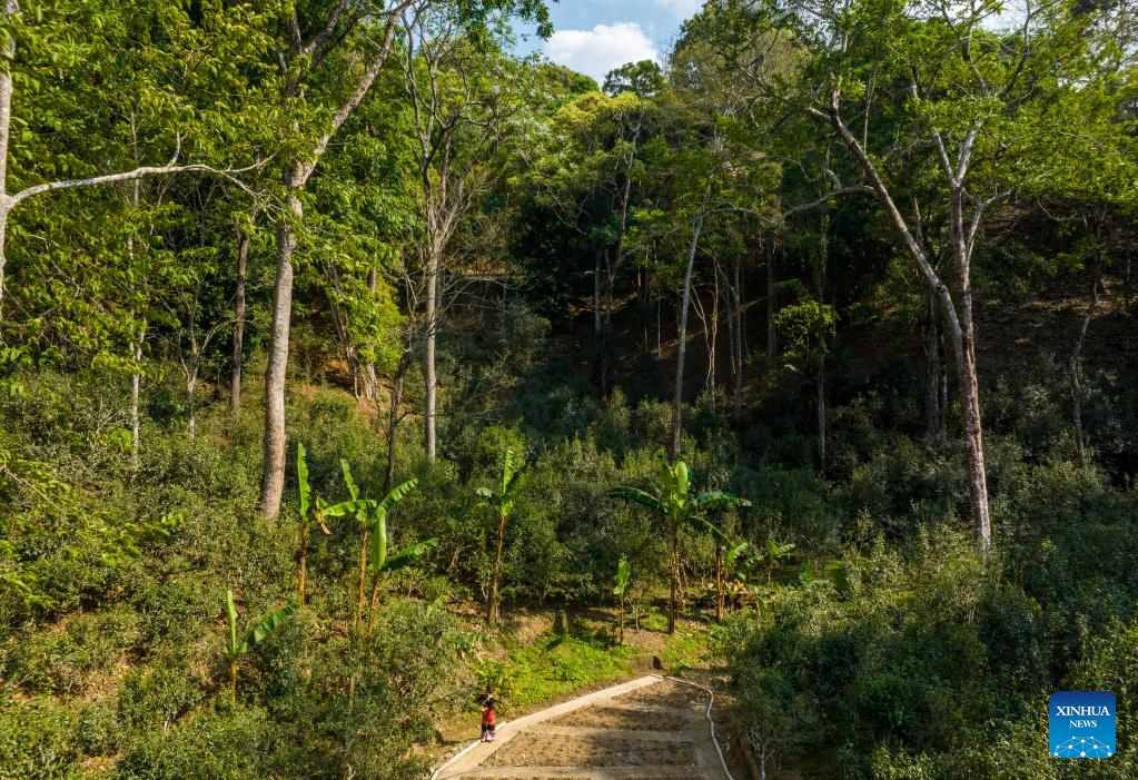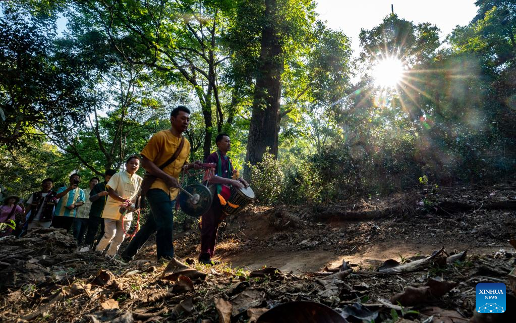 Farmers walk towards the ancient tea forests to conduct a worship ceremony on the Jingmai Mountain in Pu'er City, southwest China's Yunnan Province, March 25, 2023. Spring tea picking started in the ancient tea forests on the Jingmai Mountain on Saturday. At Jingmai, a lush mountain known for its forests of ancient tea trees, locals still maintain an ancient way of tea cultivation featuring a special multi-layered ecosystem. (Xinhua/Jiang Wenyao)