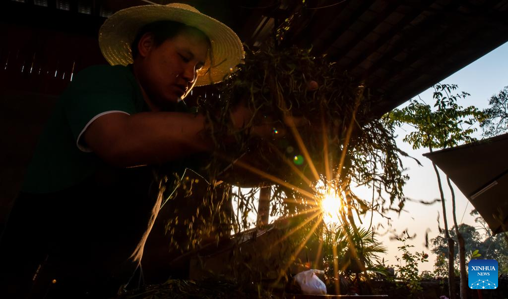 A farmer processes freshly-picked tea leaves on the Jingmai Mountain in Pu'er City, southwest China's Yunnan Province, March 25, 2023. Spring tea picking started in the ancient tea forests on the Jingmai Mountain on Saturday. At Jingmai, a lush mountain known for its forests of ancient tea trees, locals still maintain an ancient way of tea cultivation featuring a special multi-layered ecosystem. (Xinhua/Jiang Wenyao)