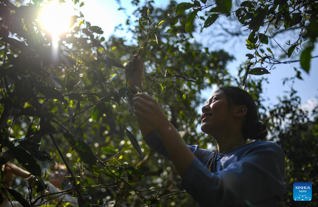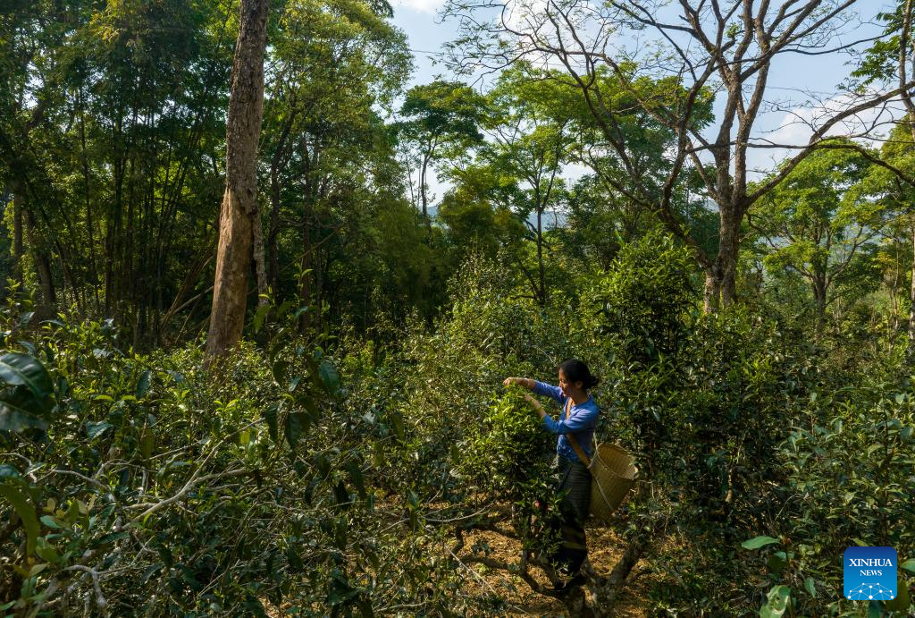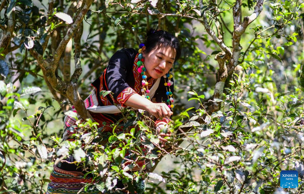 A farmer picks tea leaves in the ancient tea forests on the Jingmai Mountain in Pu'er City, southwest China's Yunnan Province, March 25, 2023. Spring tea picking started in the ancient tea forests on the Jingmai Mountain on Saturday. At Jingmai, a lush mountain known for its forests of ancient tea trees, locals still maintain an ancient way of tea cultivation featuring a special multi-layered ecosystem. (Xinhua/Jiang Wenyao)