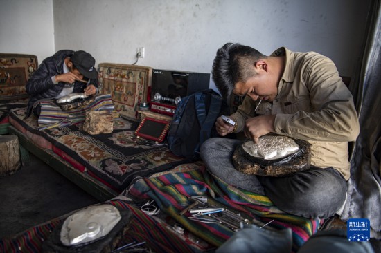Workers work on silver wares at Zhaxi Jicai Gold, Silver and Bronze Ware Factory in Shigatse city, southwest China’s Xizang Autonomous Region, March 9, 2023. (Xinhua/Sun Fei)