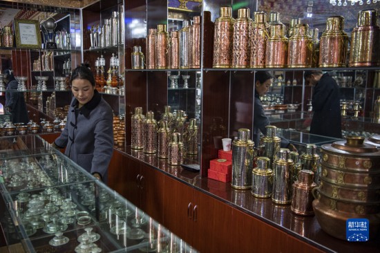 Photo taken on March 9, 2023 shows metal ware displayed at Zhaxi Jicai Gold, Silver and Bronze Ware Factory in Shigatse city, southwest China’s Xizang Autonomous Region. (Xinhua/Sun Fei)