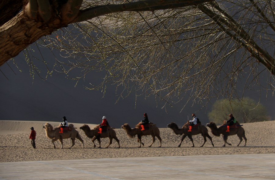 Visitors sightsee on camels in the Crescent Moon Spring scenic area in Dunhuang city, northwest China’s Gansu Province. (Photo/Zhang Xiaoliang)