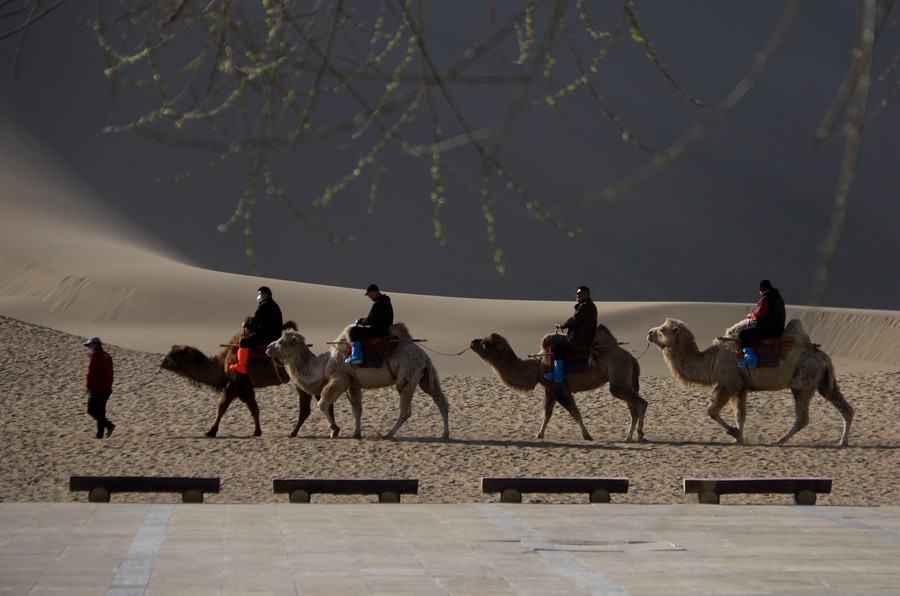 Visitors sightsee on camels in the Crescent Moon Spring scenic area in Dunhuang city, northwest China’s Gansu Province. (Photo/Zhang Xiaoliang)