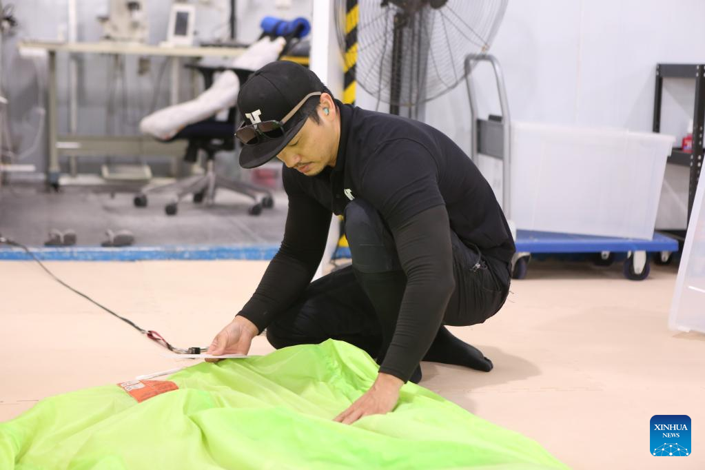 Lee Nam, a master rigger and coach from South Korea currently working for Sanya Tarhe Skydiving Club, checks the equipment at the club in Sanya, south China's Hainan Province, March 14, 2023. (Xinhua/Fan Yuqing)