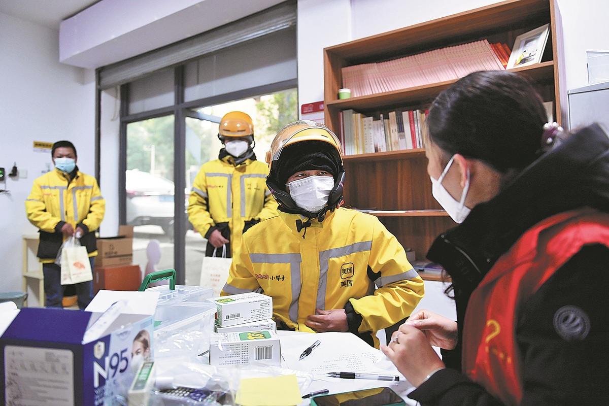 Deliverymen line up to receive medication at a medical station established for them in Changsha, Hunan province, in December. CHEN ZHENHAI/XINHUA