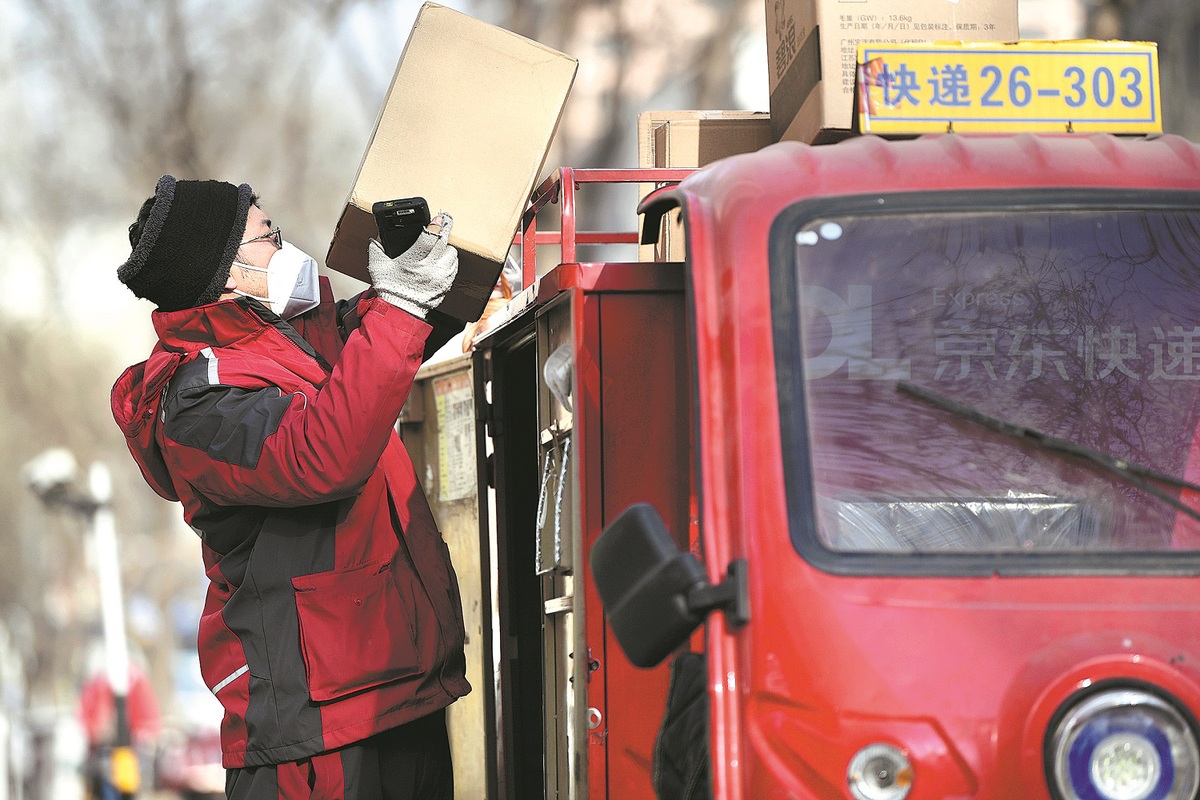 A delivery driver loads his electric cart in Lanzhou, Gansu province, in December. CHEN BIN/XINHUA