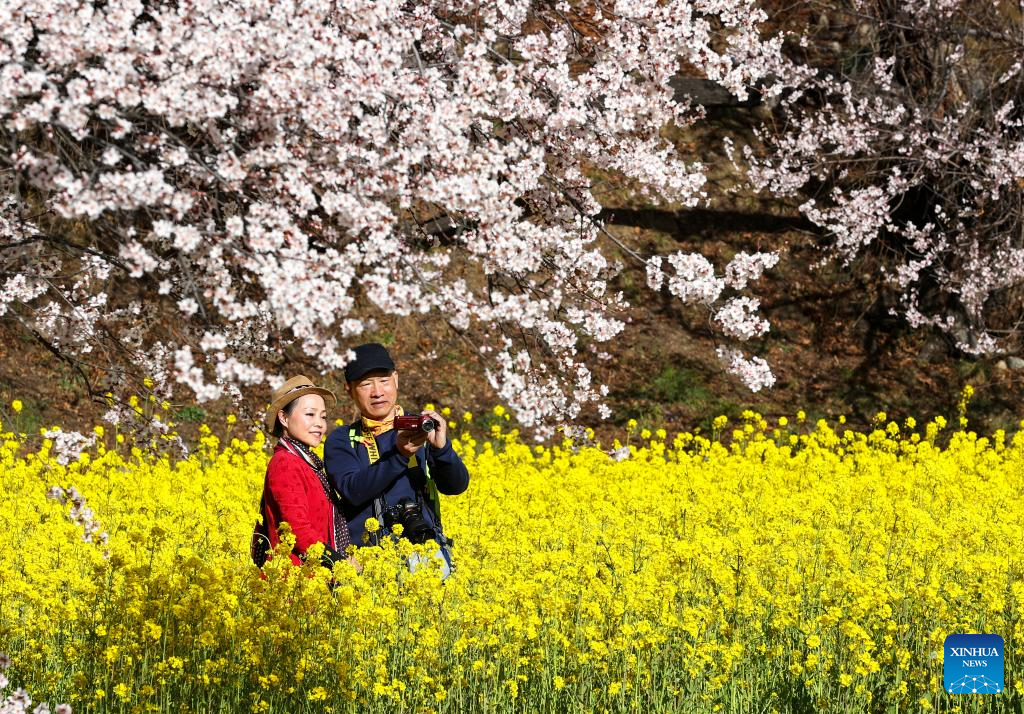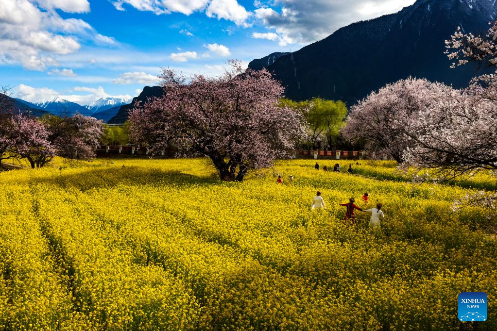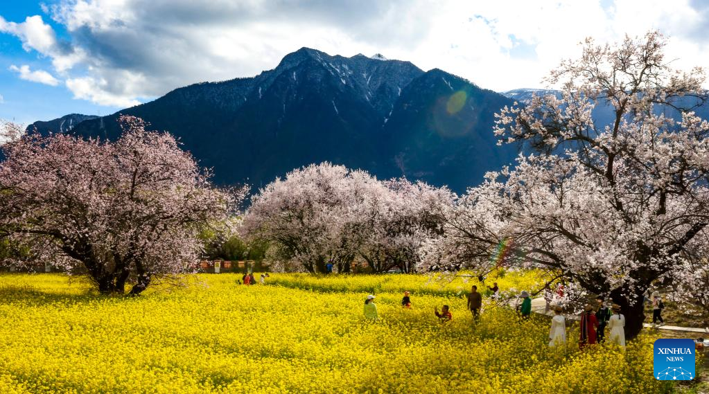 Tourists visit a peach blossom garden in Gala village of Nyingchi, southwest China's Tibet Autonomous Region, March 24, 2023. (Xinhua/Jiang Fan)