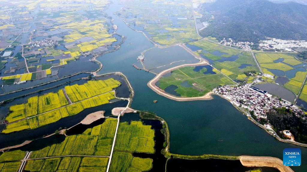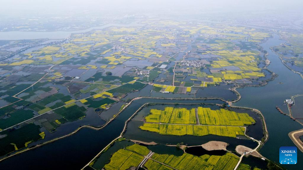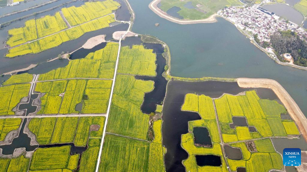This aerial photo shows the rape flower fields in Xiangshuijian Village, Eqiao Town of Sanshan District, Wuhu, east China's Anhui Province, March 27, 2023. Rape flowers in Xiangshuijian Village ushered in full bloom recently. Rivers and waterways wind through the golden rape flower fields, creating beautiful countryside scenes. (Xinhua/Zhao Xianfu)