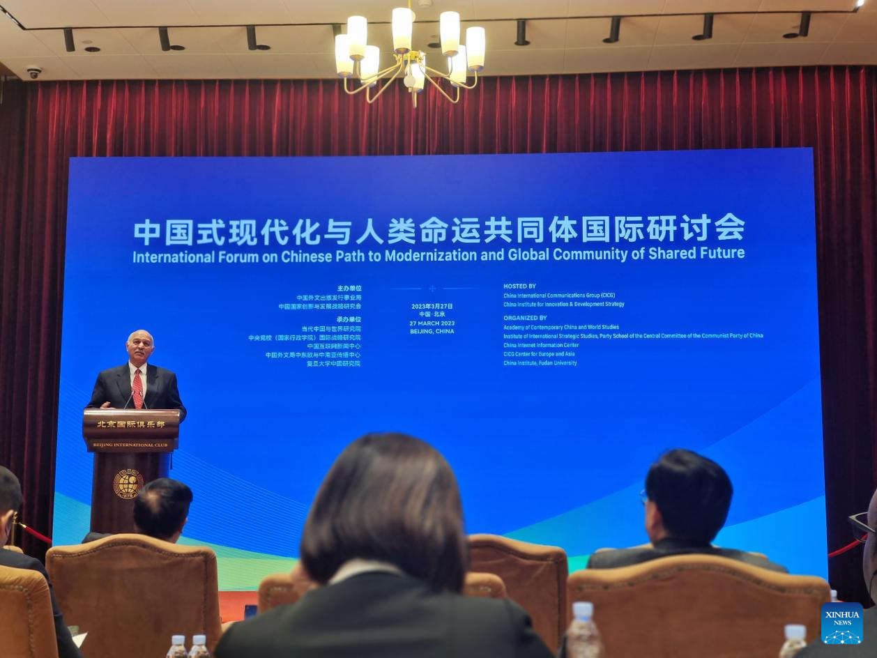 Mushahid Hussain Sayed, the Chairman of the Pakistan Senate Defence Committee and Founder Chairman of Pakistan-China Institute delivers a speech at the International Forum on Chinese Path to Modernization and Global Community of Shared Future in Beijing, capital of China, March 27, 2023. The forum was held both online and offline, gathering nearly 100 senior dignitaries, representatives of enterprises and international organizations from 14 countries. (Xinhuanet/You Huiyuan)
