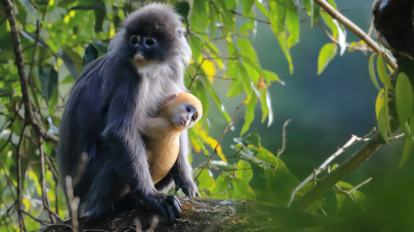 Photo shows a baby Phayre's leaf monkey cuddling with its parent in the lush forest of Mangshi city, Dehong Dai and Jingpo Autonomous Prefecture, southwest China’s Yunnan Province. (Photo/Zheng Shanhe)
