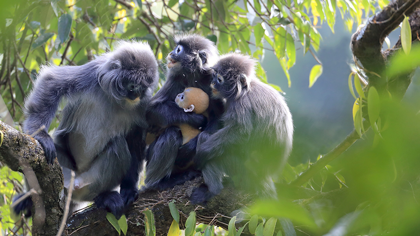 Photo shows a baby Phayre's leaf monkey cuddling with its parents in the lush forest of Mangshi city, Dehong Dai and Jingpo Autonomous Prefecture, southwest China’s Yunnan Province. (Photo/Zheng Shanhe)