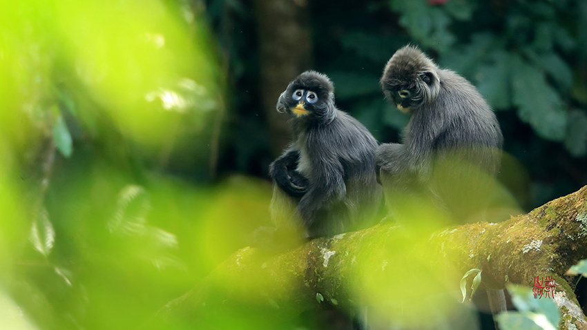 Photo shows two Phayre's leaf monkeys in the lush forest of Mangshi city, Dehong Dai and Jingpo Autonomous Prefecture, southwest China’s Yunnan Province. (Photo/Zheng Shanhe)