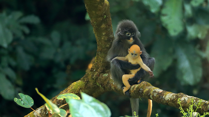 Photo shows a baby Phayre's leaf monkey cuddling with its parent in the lush forest of Mangshi city, Dehong Dai and Jingpo Autonomous Prefecture, southwest China’s Yunnan Province. (Photo/Zheng Shanhe)