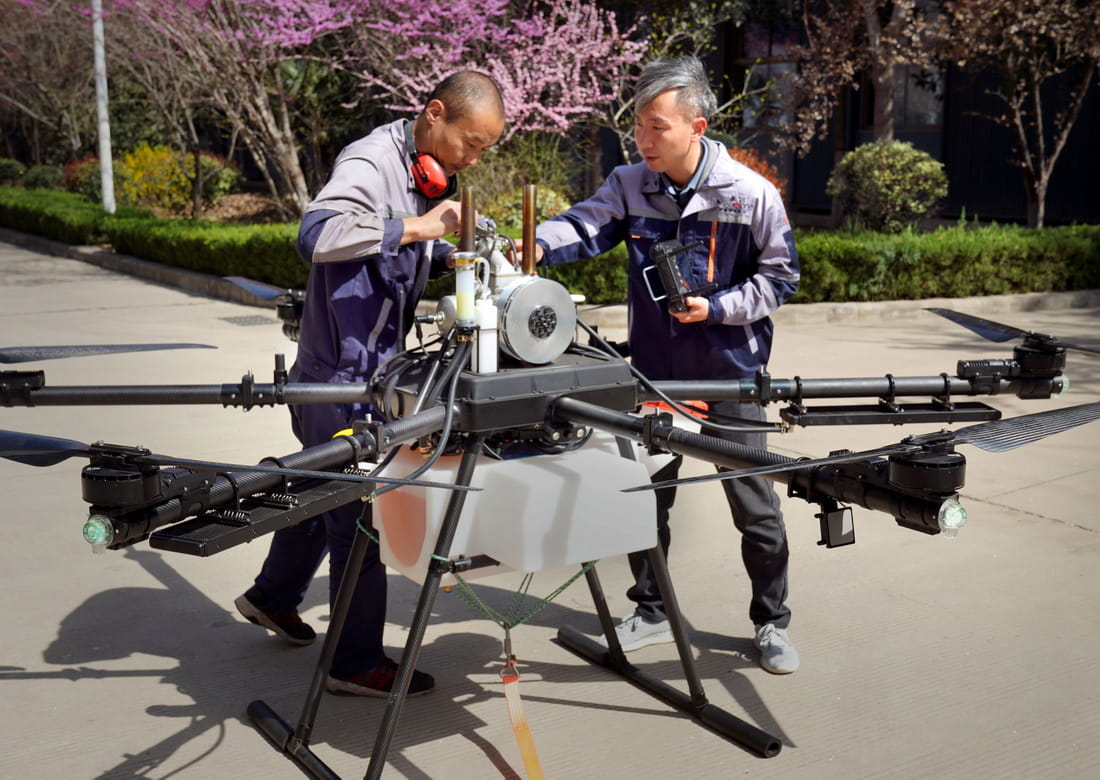 Yang Shiyi and his employee examine a drone before it takes off in Luoyang city, central China’s Henan Province, on March 14, 2023. (Photo/Xinhua)