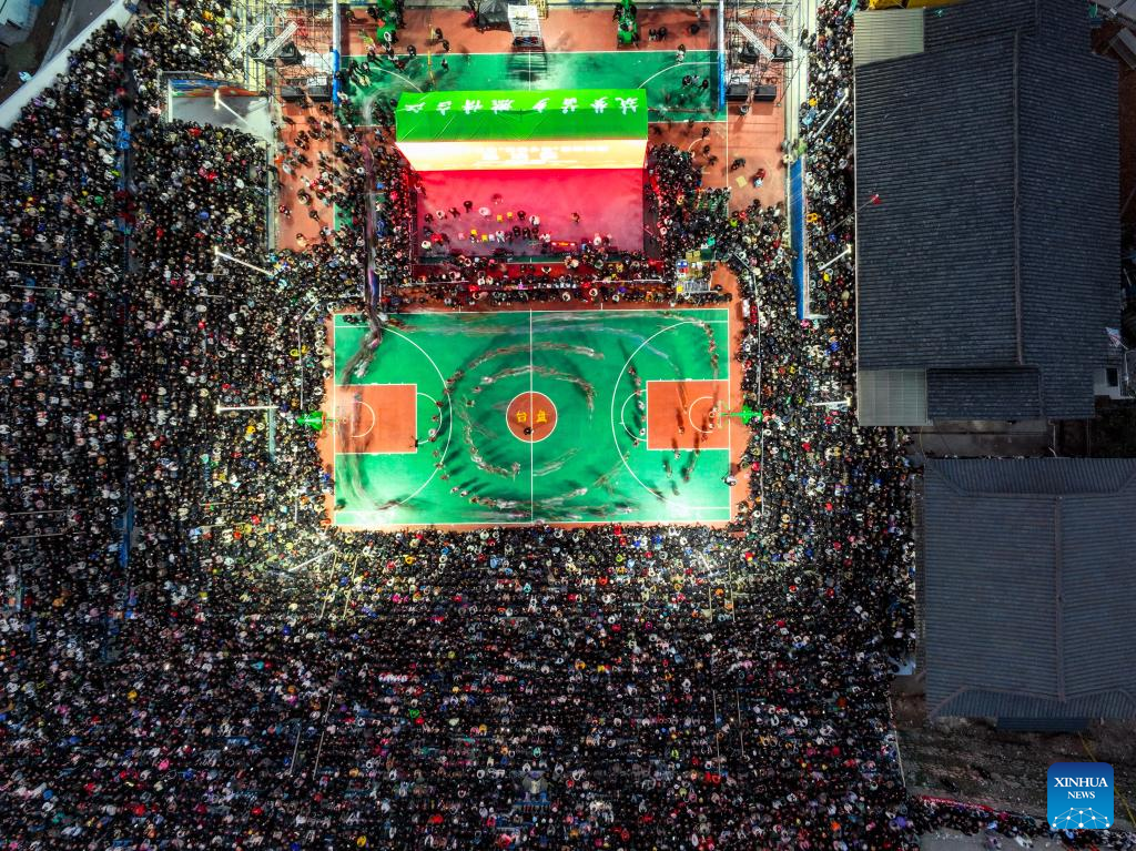 An areial photo taken on March 26, 2023 shows the basketball court prior to the third-place match between Team Tongren and Team Bijie in Taipan village, Taijiang county, Southwest China's Guizhou province. "Village Basketball Association" or "Village BA", is a grassroot basketball tournament held in Taipan village. Organized by local residents, this event has gained popularity over the years and draws a large crowd of spectators and participants alike. The tournament showcases the passion and skills of basketball players from rural areas, as they compete and demonstrate their teamwork on the court. [Photo/Xinhua]