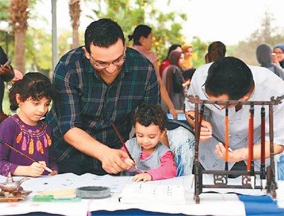 Egyptians experience Chinese calligraphy at a Confucius Institute cultural event held at the Suez Canal University.(Xinhua/Wu Huiwo)