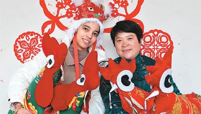 On the day of the beginning of Spring this year, Zhao Ruixue (right), a folk artisan from Nigou Town, Taierzhuang District, Zaozhuang City, Shandong Province, displays a large handmade "Spring Chicken" with her Egyptian friend Amina at home, symbolizing a prosperous and peaceful new year. (People's Visual/Sun Zhongche)
