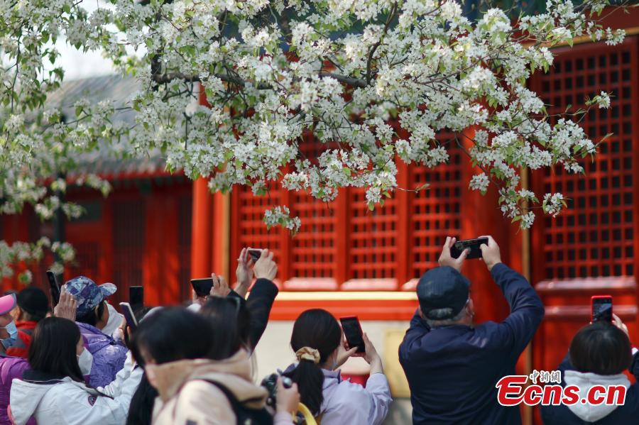 Visitors take photos of pear blossoms wafting in the breeze at Zhihua Temple of the Ming Dynasty (1368-1644) in Beijing, March 28, 2023. (Photo: China News Service/Sheng Jiapeng)