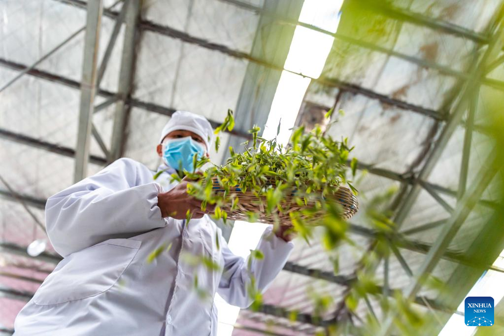 Workers process tea leaves at a tea processing factory in Baili Azalea Scenic Area, Bijie, southwest China's Guizhou Province, March 28, 2023. Recently, workers are busy in harvesting and processing tea leaves ahead of the Qingming Festival to produce the Mingqian (literally "pre-Qingming") tea, which are made of the very first tea sprouts in spring and considered to be of high quality. (Xinhua/Zhao Hongbo)