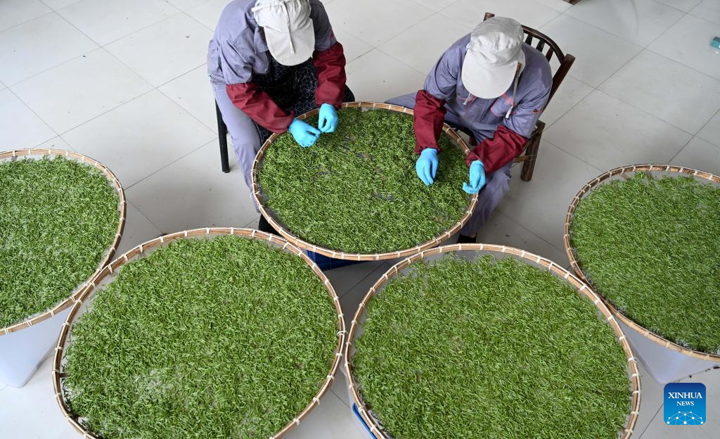 Workers select tea sprouts picked early in the morning at a tea factory in Wuyi County, east China's Zhejiang Province, March 28, 2023. Recently, workers are busy in harvesting and processing tea leaves ahead of the Qingming Festival to produce the Mingqian (literally "pre-Qingming") tea, which are made of the very first tea sprouts in spring and considered to be of high quality. (Xinhua/Zhang Jiancheng)