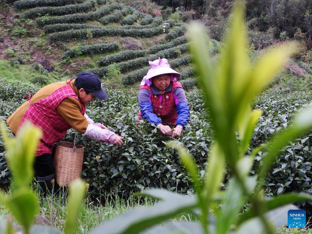 Workers harvest tea leaves at a tea garden in Songshu'ao Village of Maoping Town in Zigui County, Yichang, central China's Hubei Province, March 28, 2023. Recently, workers are busy in harvesting and processing tea leaves ahead of the Qingming Festival to produce the Mingqian (literally "pre-Qingming") tea, which are made of the very first tea sprouts in spring and considered to be of high quality. (Xinhua/Wang Huifu)