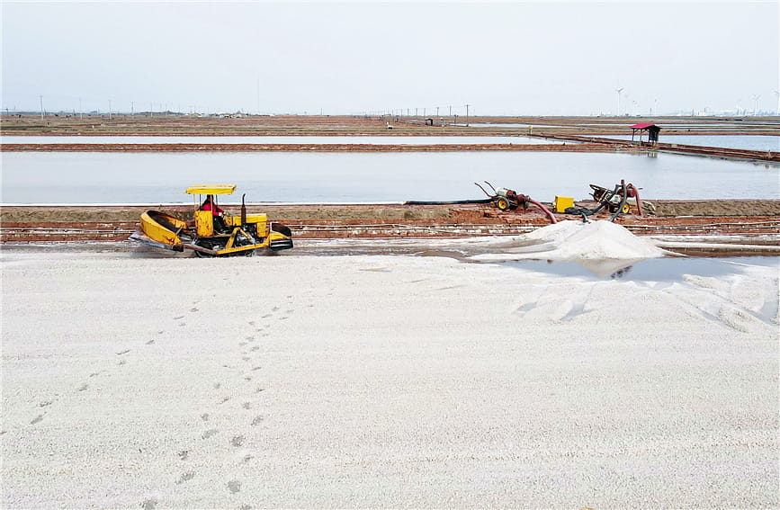 Photo shows machines working on the Changlu Hangu salt field in north China’s Tianjin Municipality. (Photo/Wu Di)
