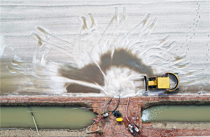 Aerial photo shows machines working on the Changlu Hangu salt field in north China’s Tianjin Municipality. (Photo/Wu Di)