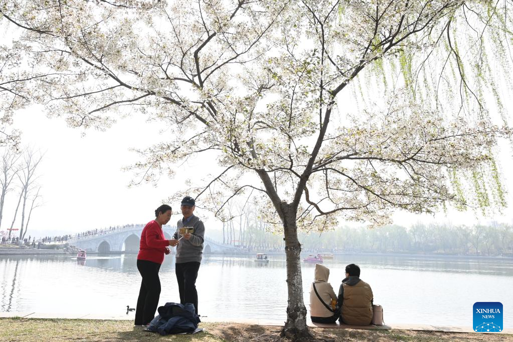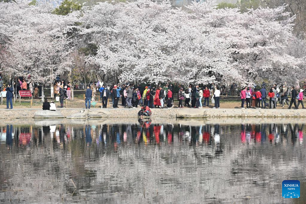 Tourists view cherry blossoms at the Yuyuantan Park in Beijing, capital of China, March 29, 2023. (Xinhua/Yin Dongxun)