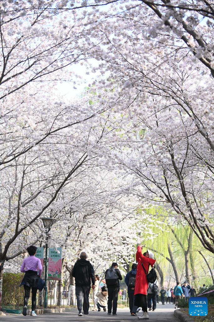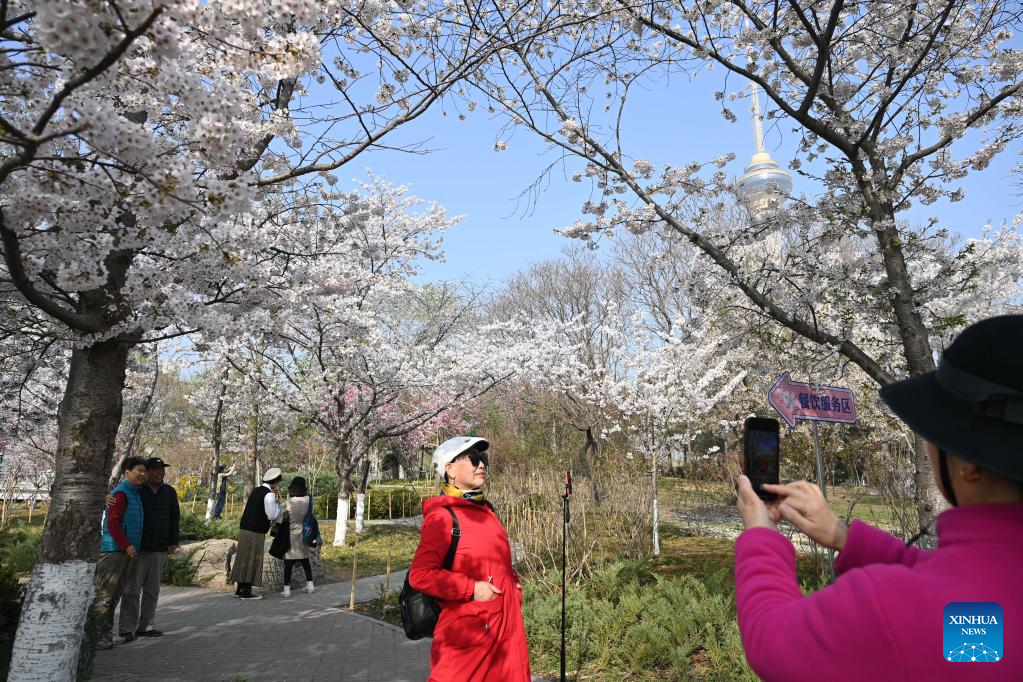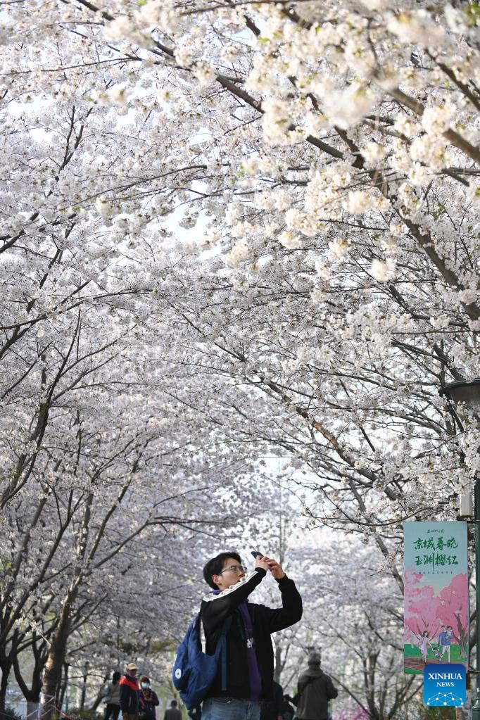 A tourist takes photos of cherry blossoms at the Yuyuantan Park in Beijing, capital of China, March 29, 2023. (Xinhua/Yin Dongxun)