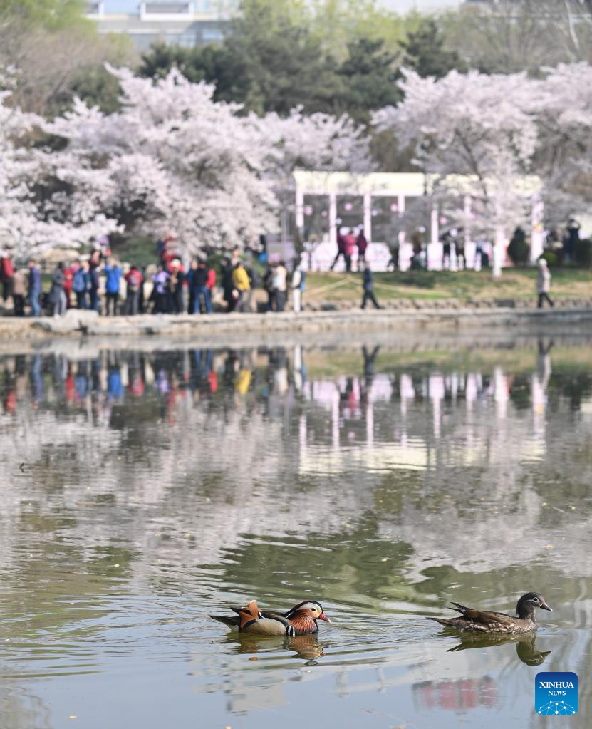 Mandarin ducklings swim on a lake as tourists view cherry blossoms at the Yuyuantan Park in Beijing, capital of China, March 29, 2023. (Xinhua/Yin Dongxun)