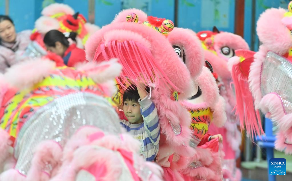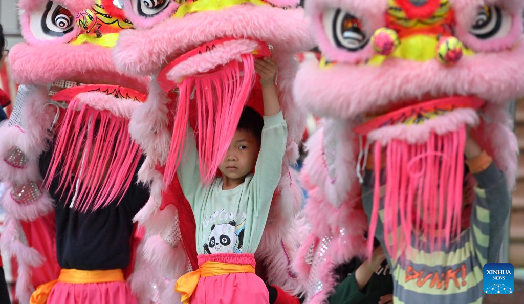 Children prepare to practice lion dance at a kindergarten in Tengxian County of Wuzhou, south China's Guangxi Zhuang Autonomous Region, March 28, 2023. (Xinhua/Huang Xiaobang)