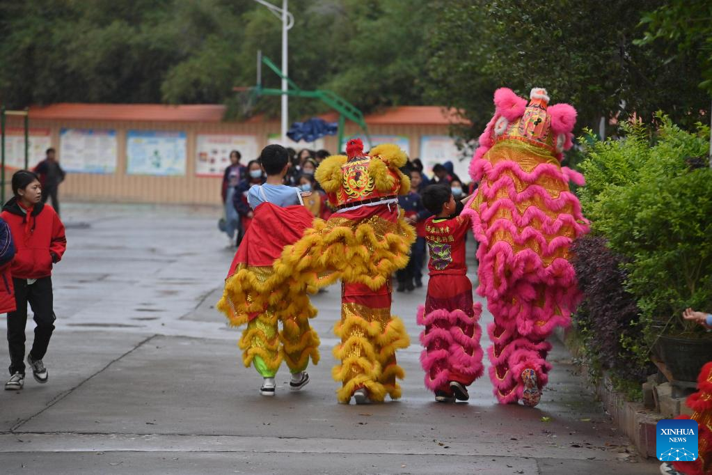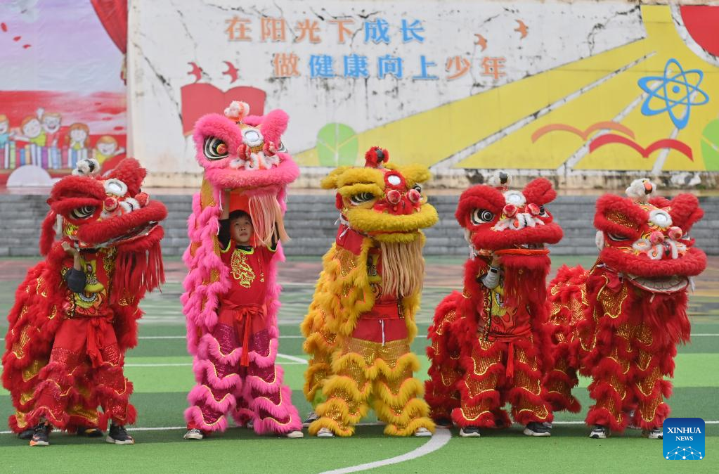 Students practice lion dance at a primary school in Tengxian County of Wuzhou, south China's Guangxi Zhuang Autonomous Region, March 28, 2023. (Xinhua/Huang Xiaobang)
