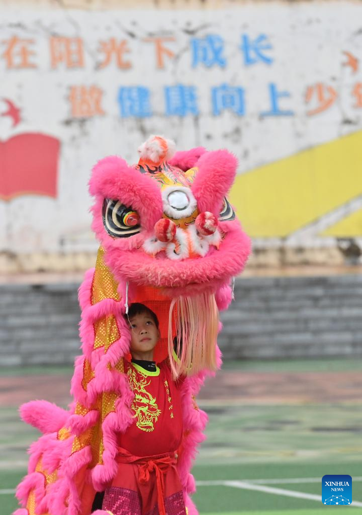 A student practices lion dance at a primary school in Tengxian County of Wuzhou, south China's Guangxi Zhuang Autonomous Region, March 28, 2023. (Xinhua/Huang Xiaobang)