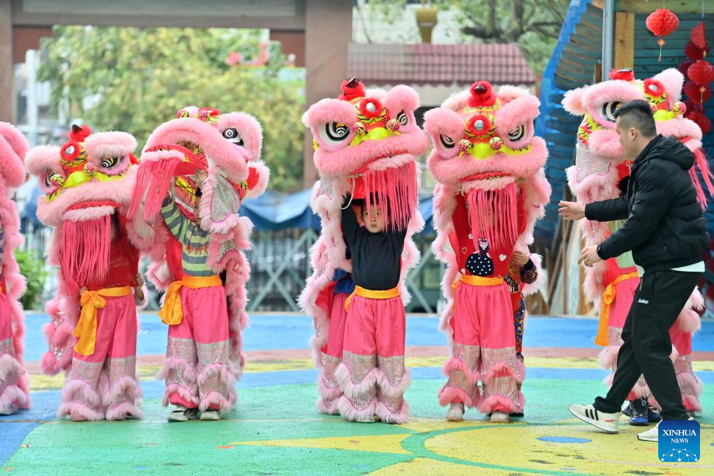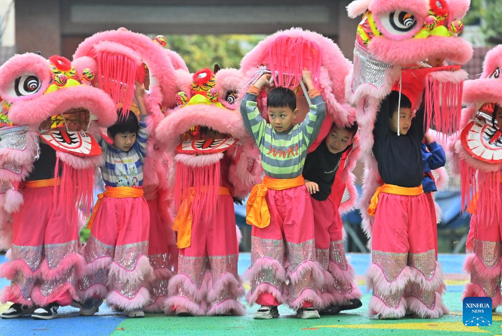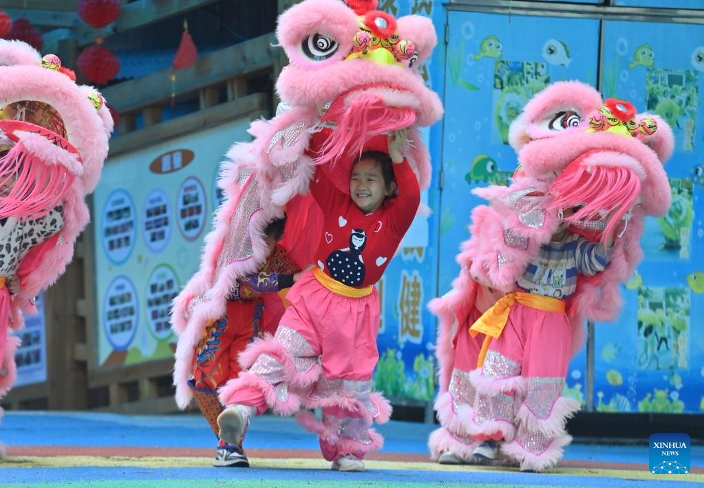 Children practice lion dance at a kindergarten in Tengxian County of Wuzhou, south China's Guangxi Zhuang Autonomous Region, March 28, 2023. (Xinhua/Huang Xiaobang)