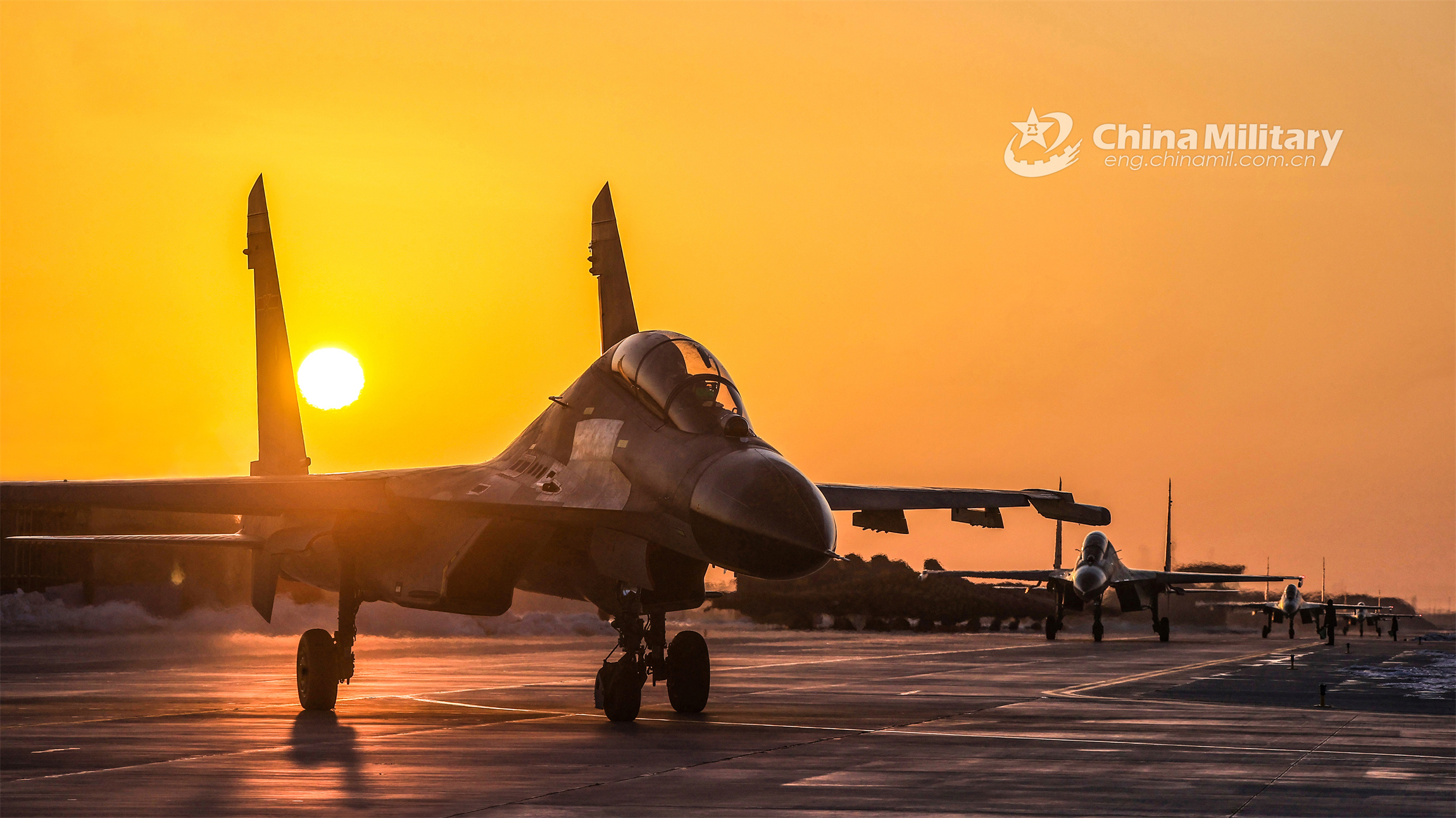 Fighter jets attached to a brigade of the PLA Air Force Xi'an Flying College taxi on the runway to get ready for a real-combat flight training exercise in mid-March, 2023. (eng.chinamil.com.cn/Photo by Cui Baoliang)