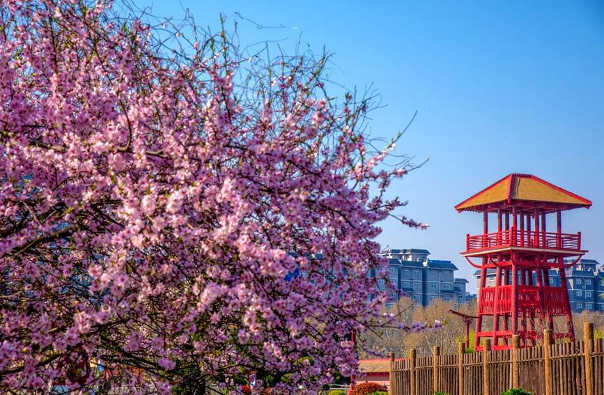 Photo shows blooming flowers in Yinxu National Archaeological Site Park in Anyang city, central China’s Henan Province. (Photo/Peng Jie)