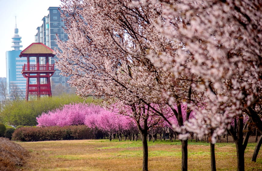 Photo shows blooming flowers in Yinxu National Archaeological Site Park in Anyang city, central China’s Henan Province. (Photo/Peng Jie)