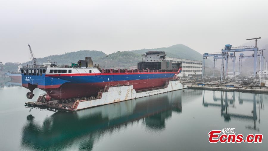 The world's largest and China's 1st 10,000-tonne cable laying vessel, Longyin 9, hits the water in Jiujiang, east China's Jiangxi Province, March 30, 2023. (Photo: China News Service/Wei Dongsheng)