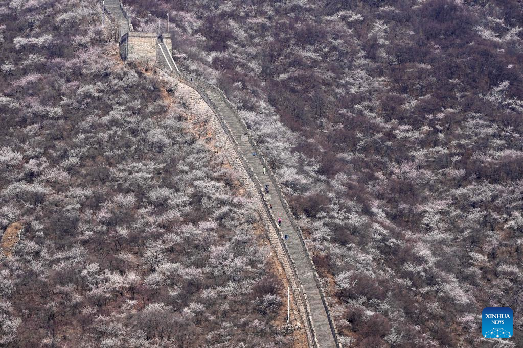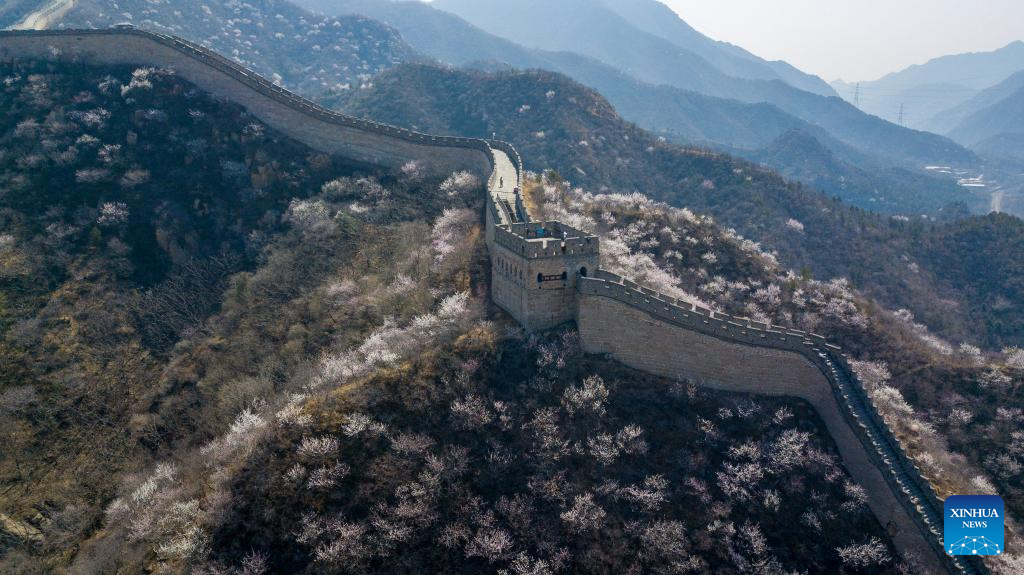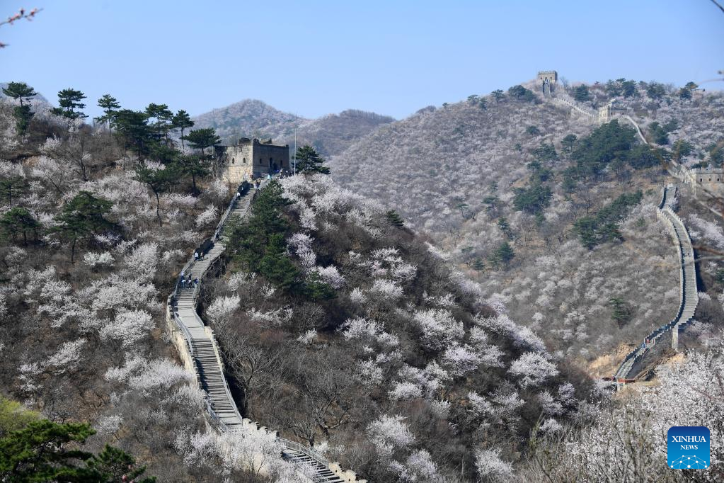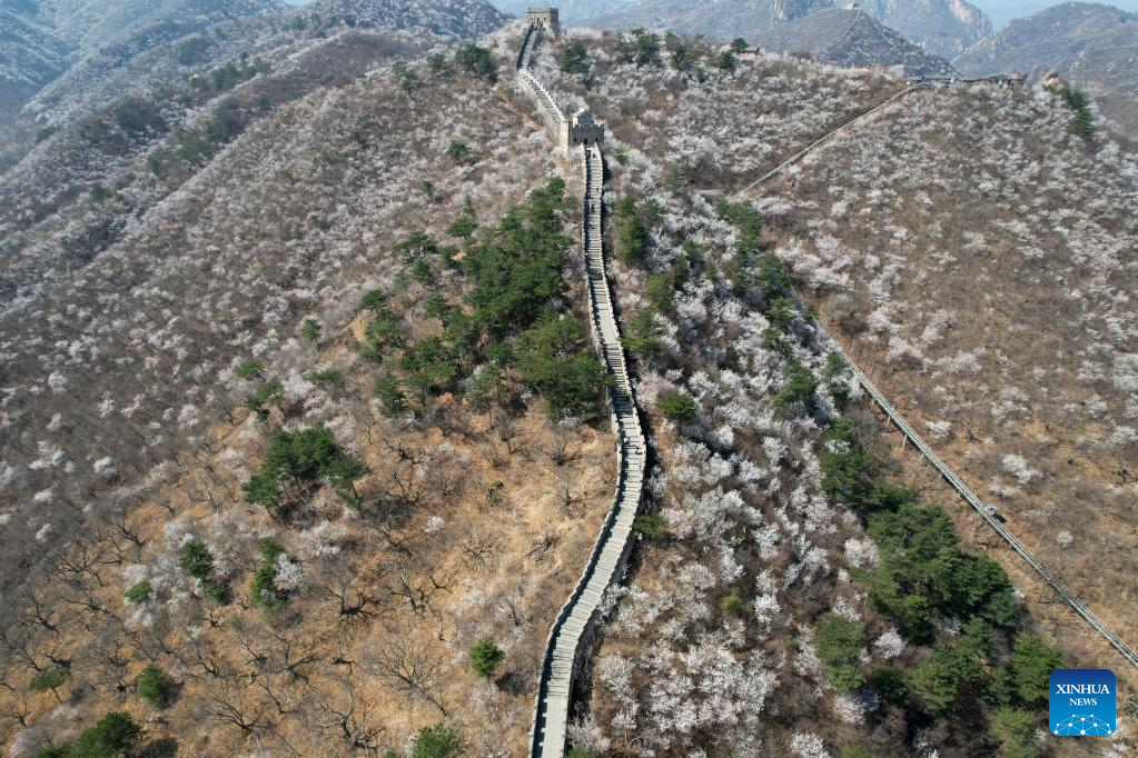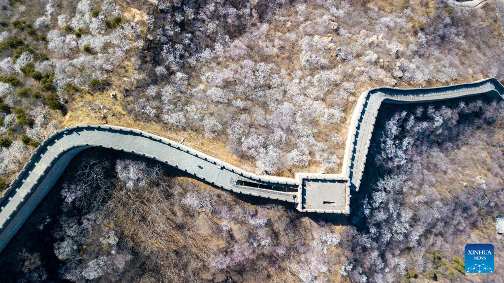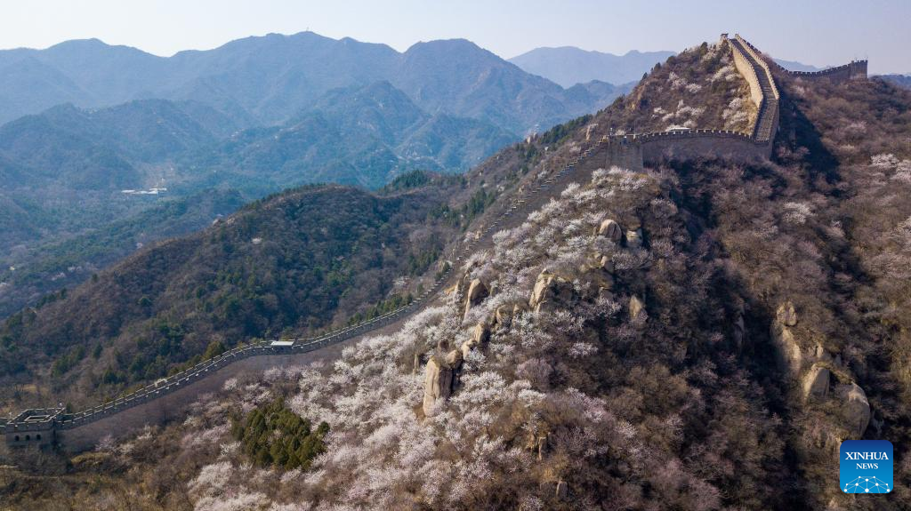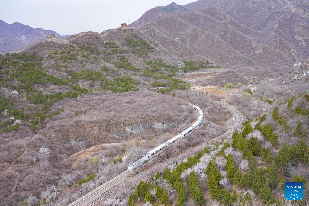 A train runs amid blooming flowers near the Juyongguan section of the Great Wall in Beijing, capital of China, March 23, 2023. (Xinhua/Chen Zhonghao)