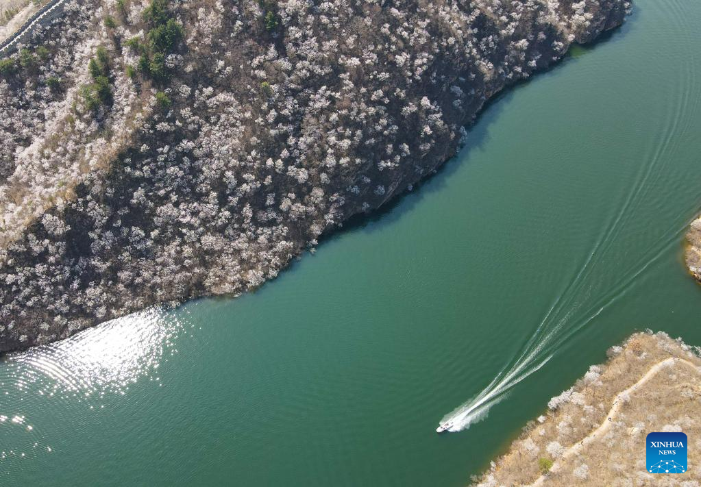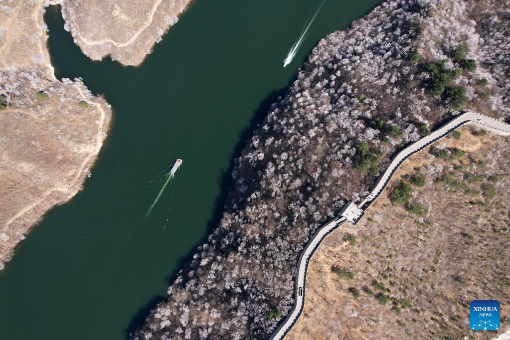 This aerial photo taken on March 29, 2023 shows a boat sailing at the foot of the Huanghuacheng Lakeside Great Wall Reserve in Beijing, capital of China. (Xinhua/Chen Zhonghao)