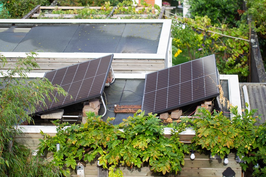 Solar panels are placed on the roofs of buildings in Haarlem, the Netherlands, Sept. 10, 2022. (Photo by Sylvia Lederer/Xinhua)