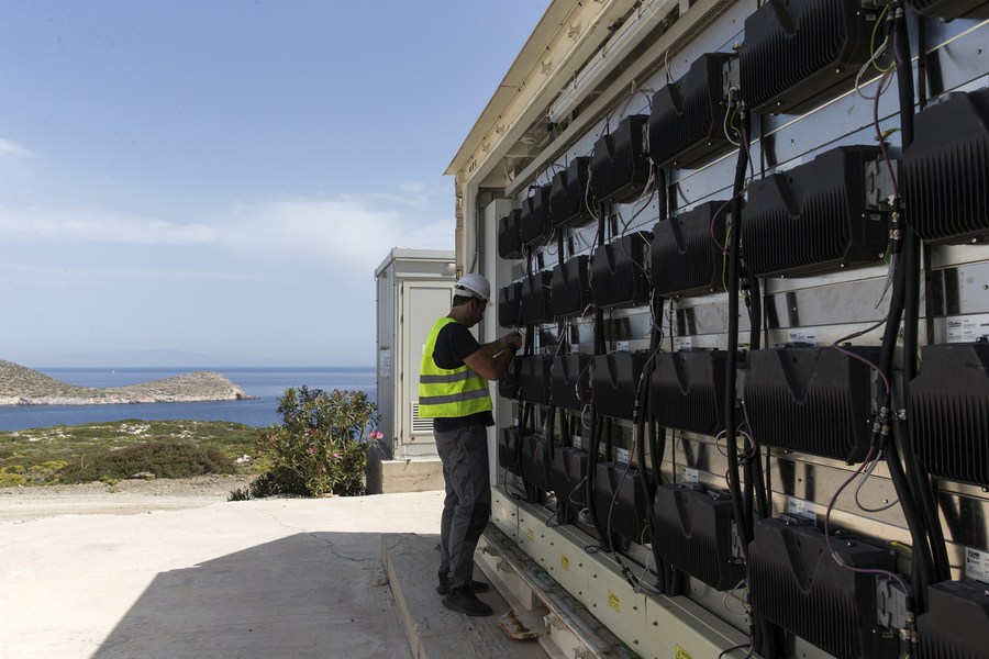 An employee works by the batteries of the energy storage system on the island of Tilos, Greece, May 9, 2022. (Photo by Marios Lolos/Xinhua)