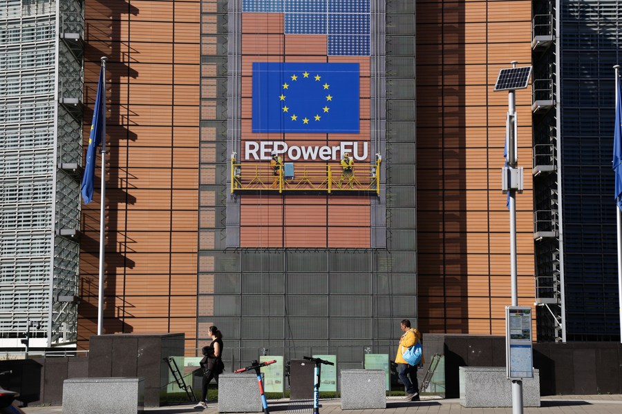 Pedestrians pass the building of the European Commission in Brussels, Belgium, Oct. 18, 2022. (Xinhua/Zheng Huansong)