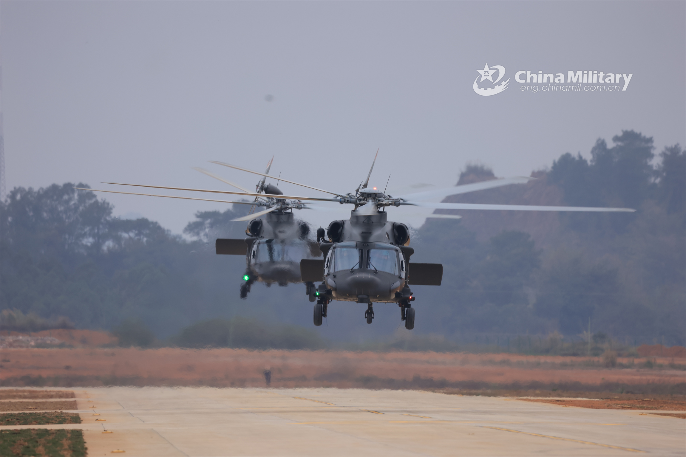 Helicopters attached to a brigade under the PLA 75th Group Army lift off for a recent formation flight training exercise. (eng.chinamil.com.cn/Photo by Sun Changyi)
